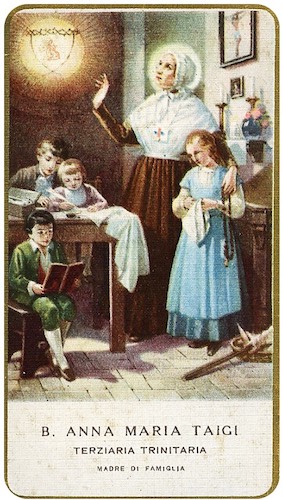 La Beata Ana María Taigi nació en Siena, el día 30 de mayo de 1769. Emigrada a Roma, se casó y tuvo siete hijos. Aunque muy ocupada en los trabajos del hogar, no descuidó las obras de misericordia, particularmente con los pobres y los enfermos. Rica en virtud, la gente buscó en ella consejo. Murió el día 9 de junio de 1837. Sus reliquias se veneran en la basílica de San Crisógono, Roma.